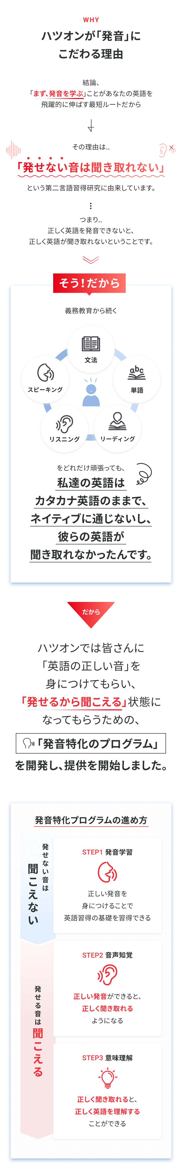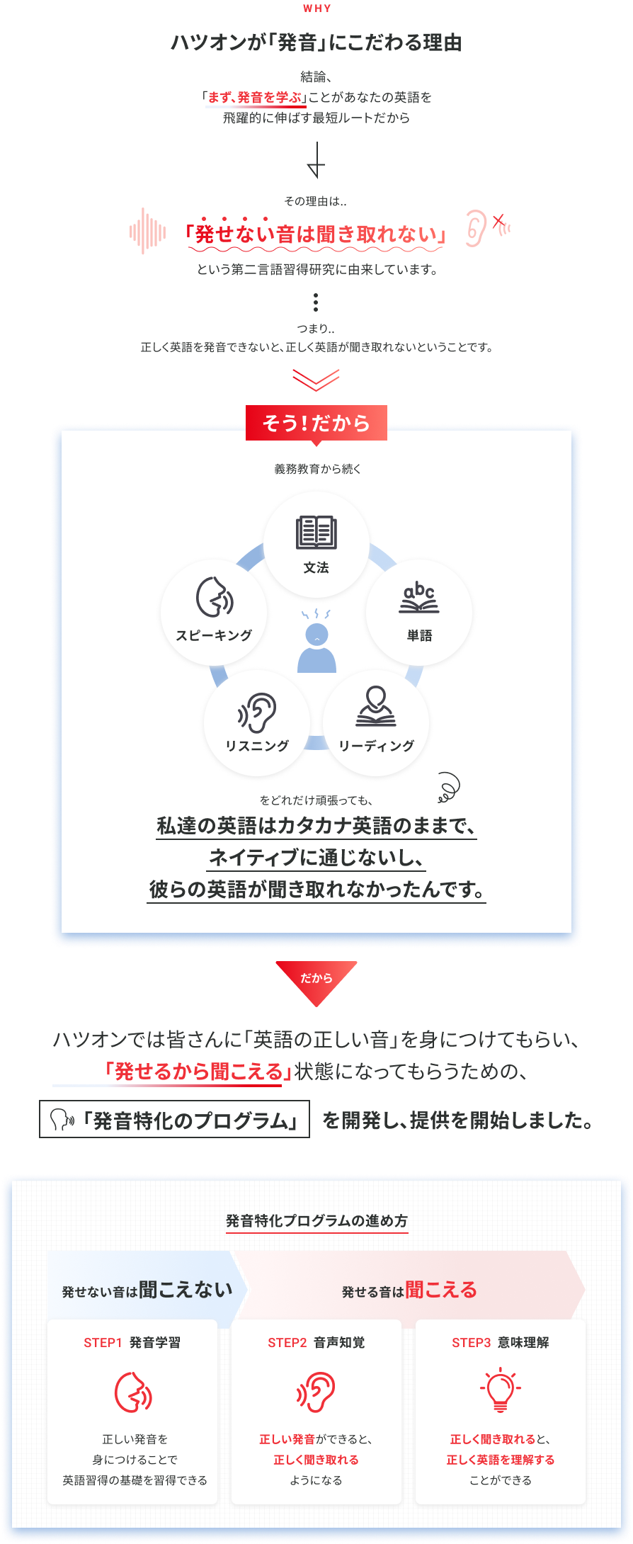 日本人が英語でうまくコミュニケーションを取れない原因の多くは発音に起因しています。多くのスキルを総合的に学ぶのではなく、まずは英語の基礎である発音を徹底的に学び、英語ネイティブに近い音を出せるようになることで、最短でスピーキング力の向上を実現することが可能です。