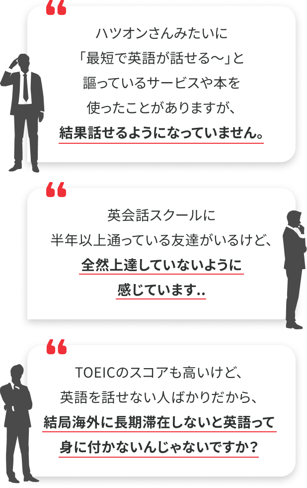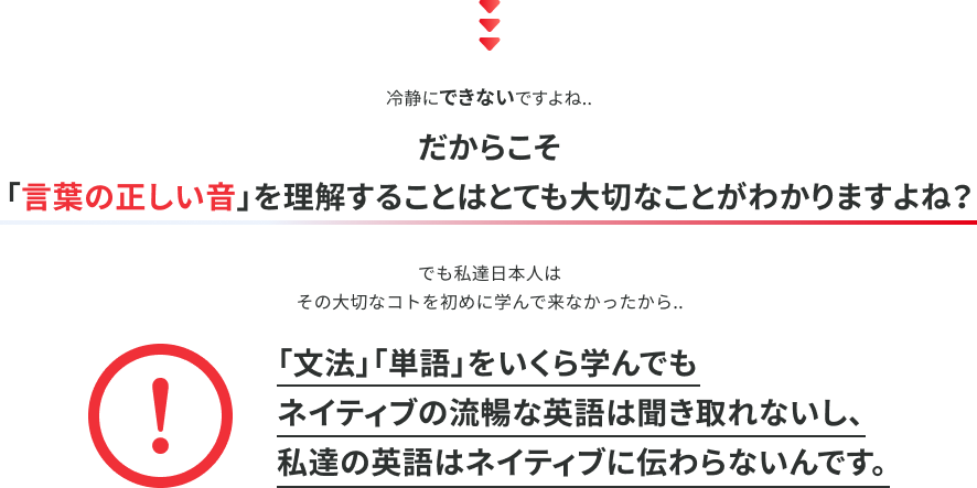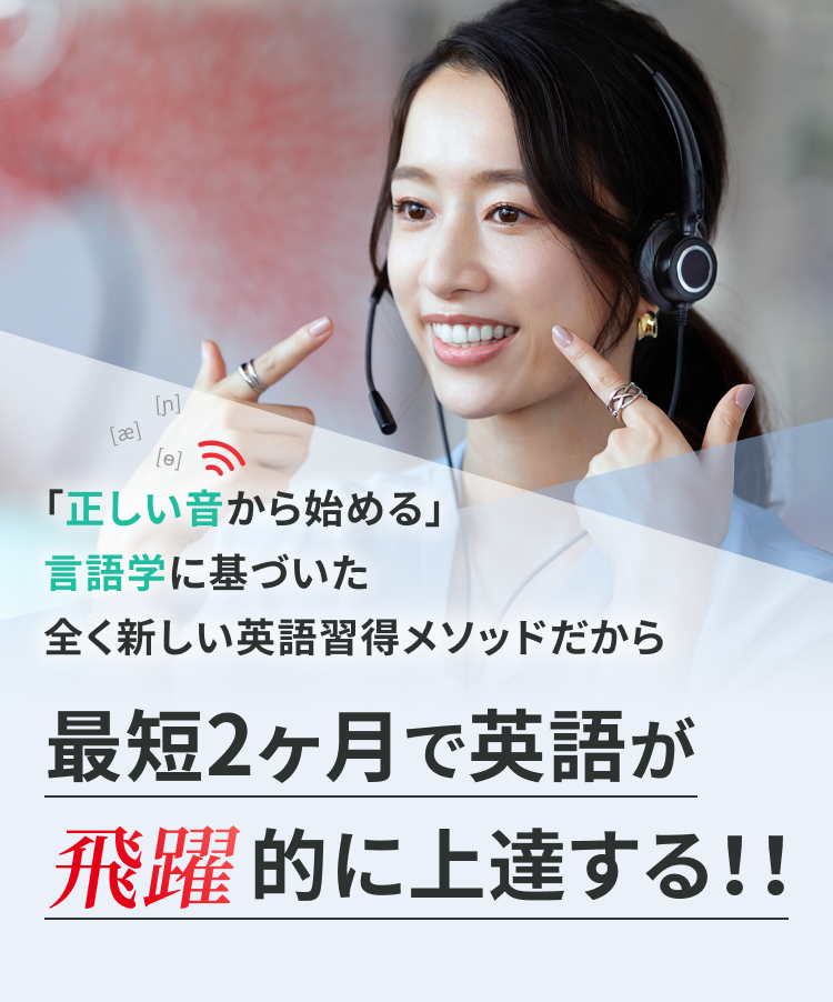 日本人が英語でうまくコミュニケーションを取れない原因の多くは発音に起因しています。多くのスキルを総合的に学ぶのではなく、まずは英語の基礎である発音を徹底的に学び、英語ネイティブに近い音を出せるようになることで、最短でスピーキング力の向上を実現することが可能です。