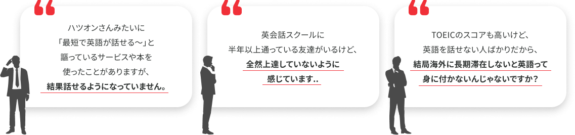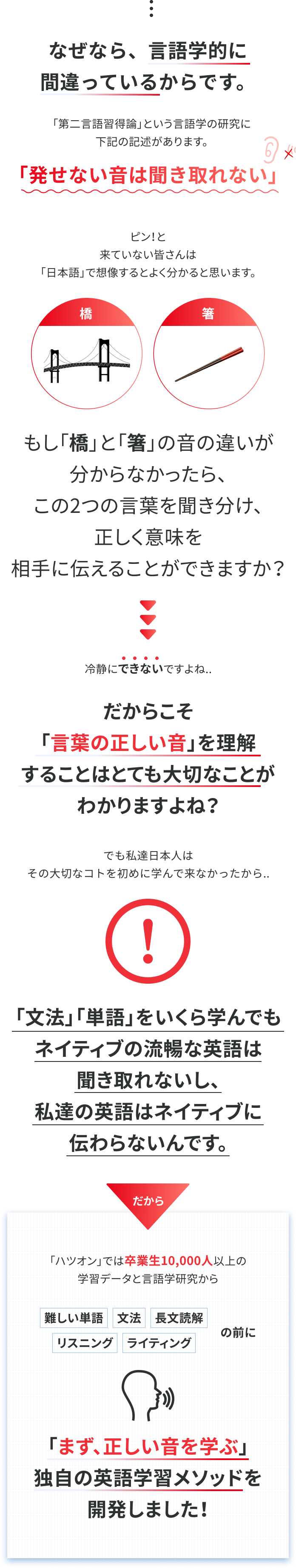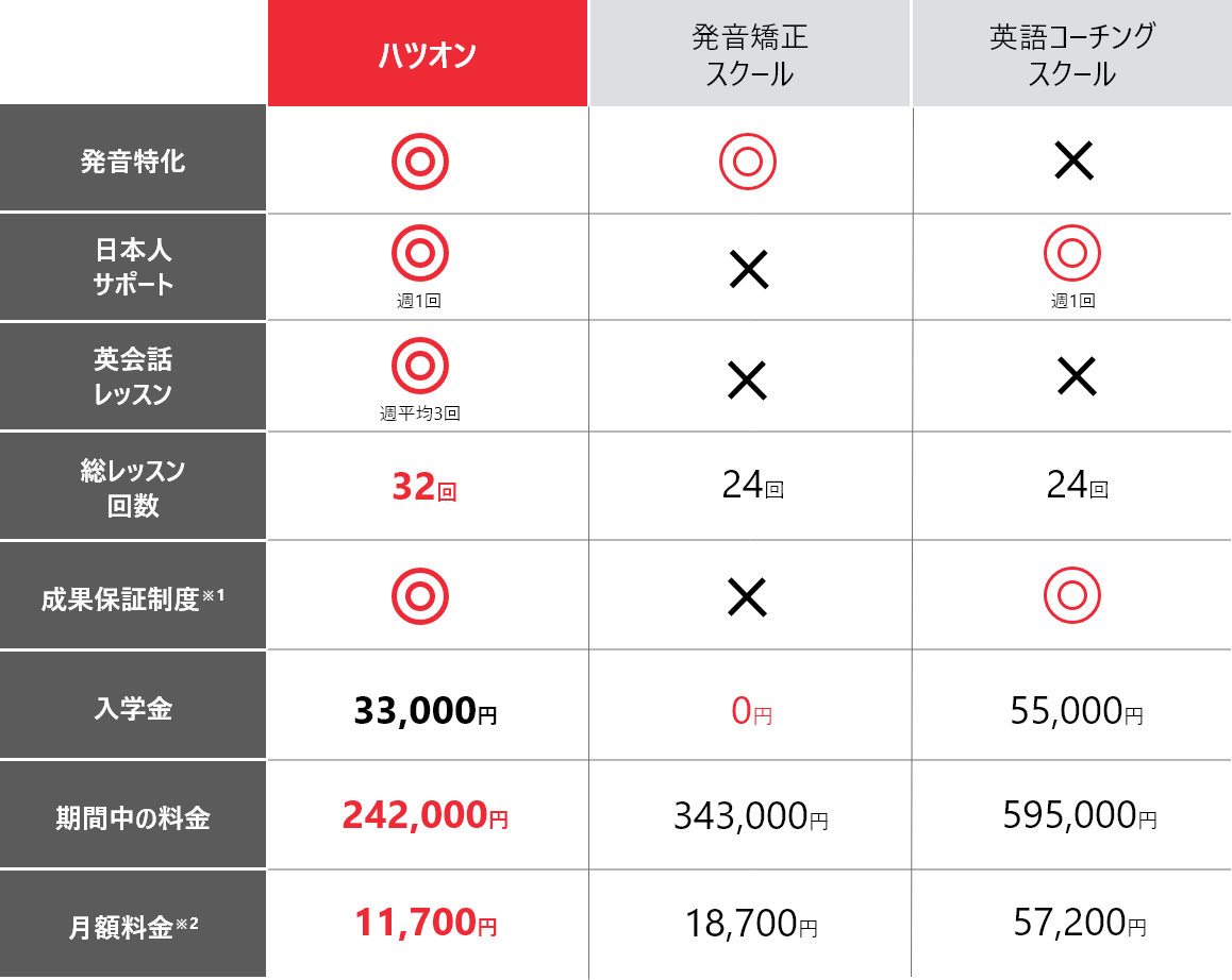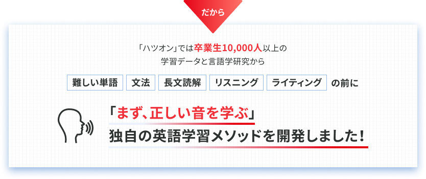 通常の英会話スクールでは、英単語、文法、リスニング、ライティングなど、幅広いスキルを長期に渡って学習していきますが、ハツオンでは、発音学習を短期集中で行います。発音学習を行なった後に、他のサービスで学習を継続することで最も効果的語学習得が可能となります。