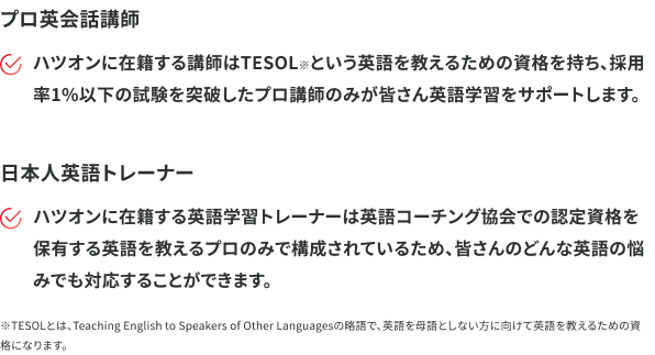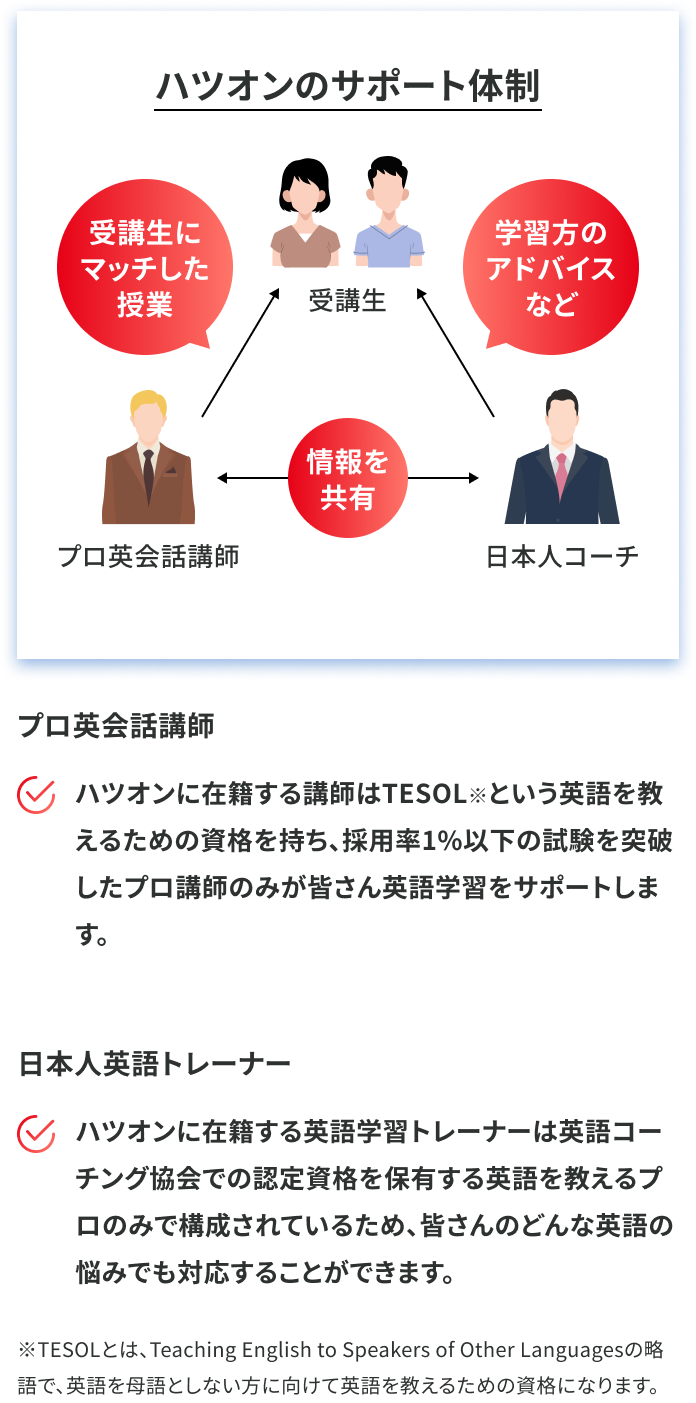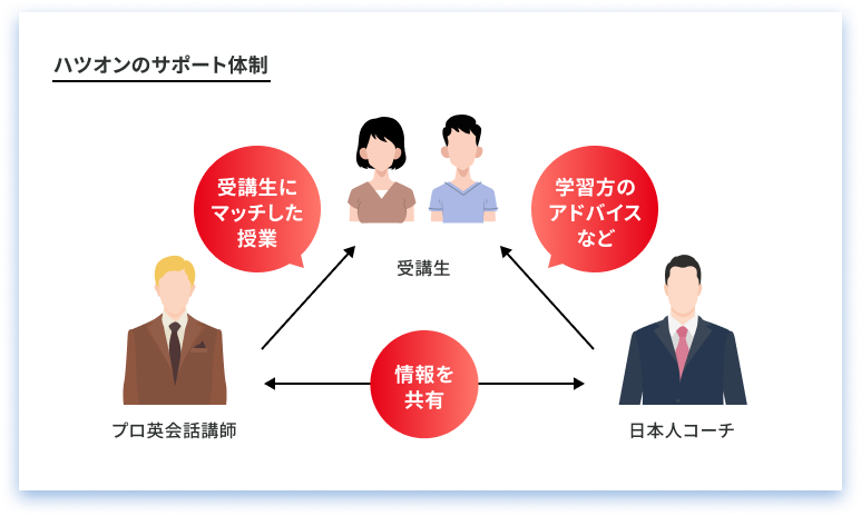 ハツオンでは日本人英語トレーナーとプロ講師の2人で学習指導に当たります。
